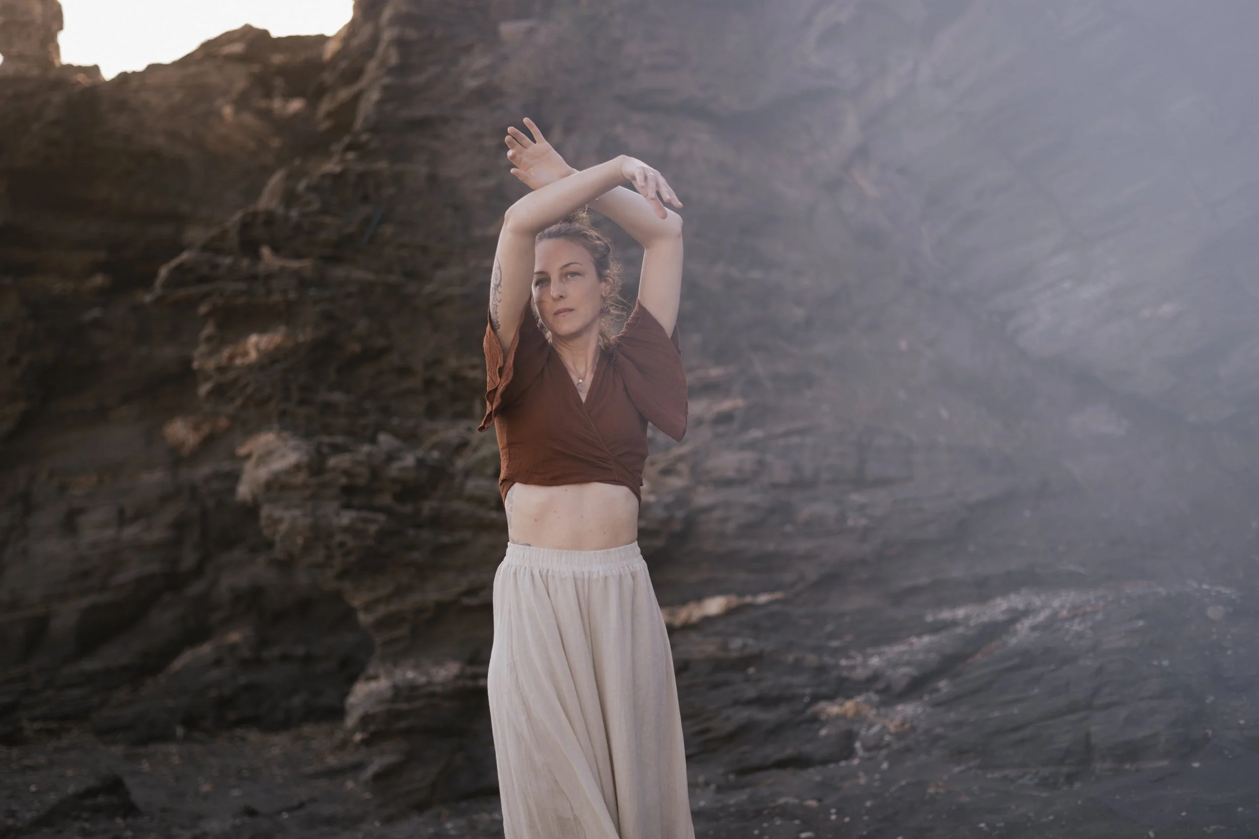 Ich arbeite mit Körperarbeit, kleinen Ritualen und Übungen, die dich aus dem Kopf wieder mehr in deinen Körper bringen. Nicht kompliziert, sondern so, dass du dich selbst wieder spürst und dein Ausdruck daraus entstehen kann.